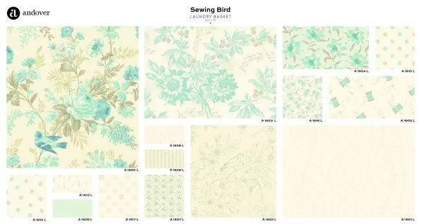 Paquet de 42 carrés de 12,5 x 12,5 cm collection Sewing Bird de Edyta Sitar pour Laundry Basket pour Andover.