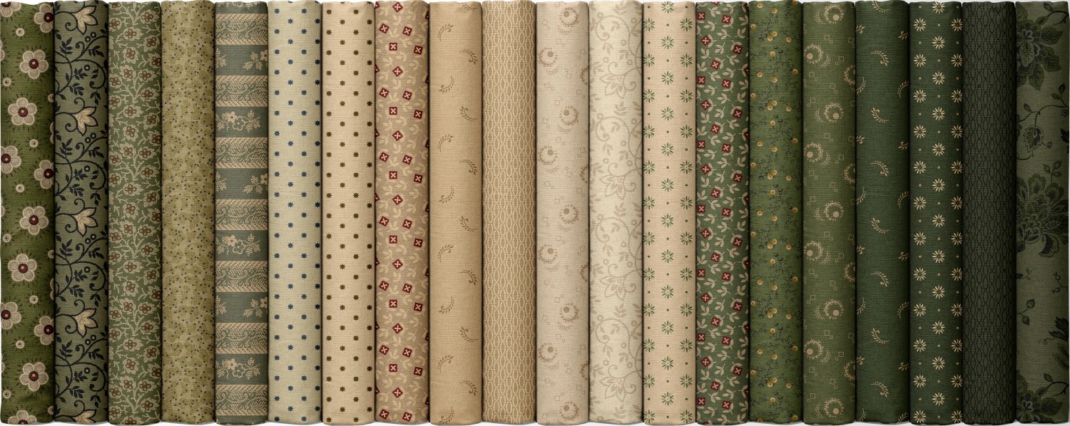 Paquet de 42 carrés de 25 x 25 cm collection Old Village Green de Pam Buda pour Marcus Fabrics.